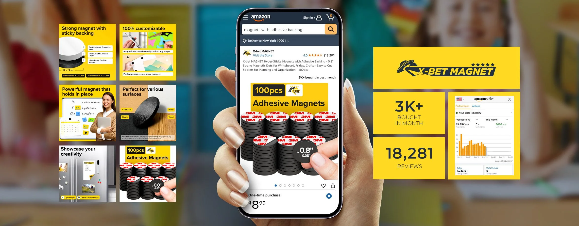 • A person holding a smartphone displaying an Amazon product listing for adhesive magnets, with various promotional banners and customer reviews in the background.