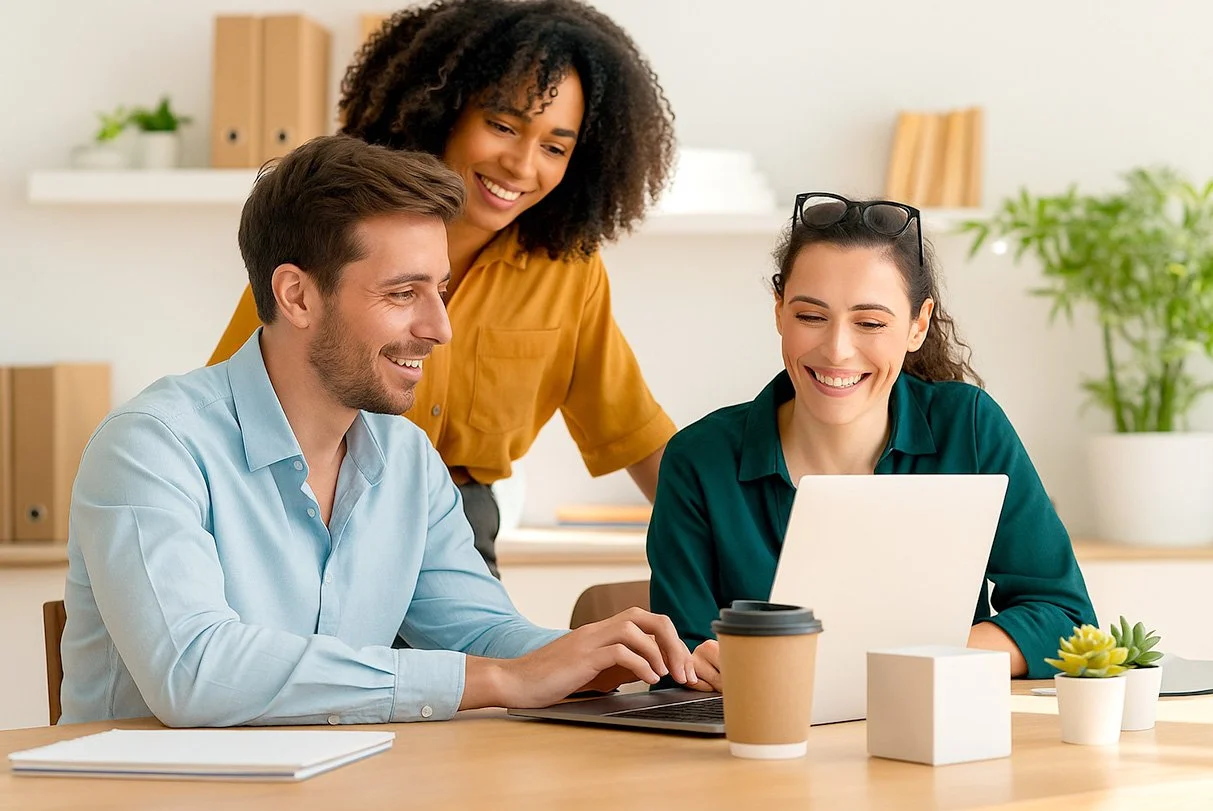 Three smiling coworkers working together at a desk with a laptop, coffee cup, and potted plants in an office.