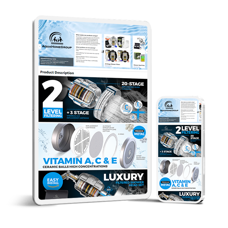 A digital advertisement for a luxury shower head set featuring a 20-stage filter with ceramic balls containing vitamins A, C, and E, and easy installation.
