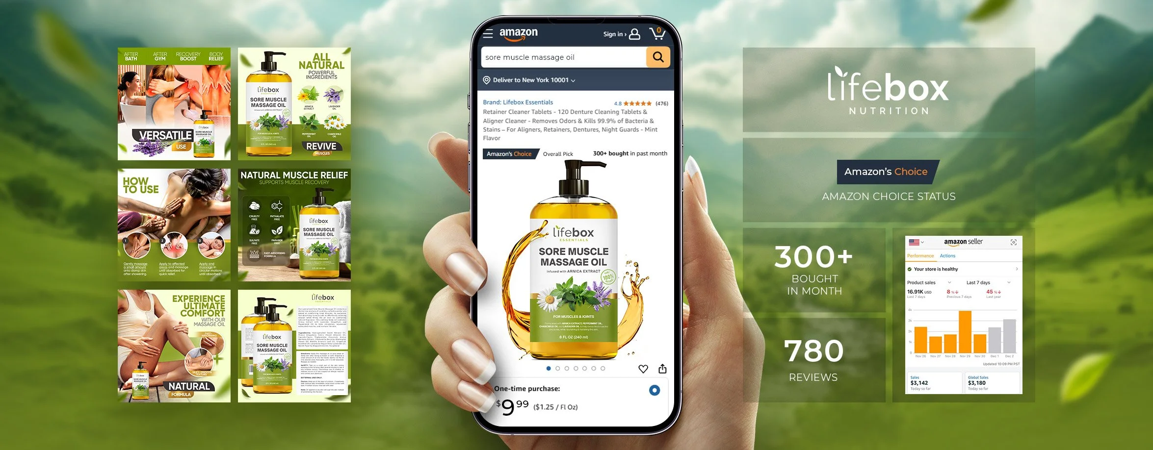 • Digital collage of a bottle of LifeBox soreness muscle massage oil displayed on a smartphone app, with promotional images and text about the product on the left, and statistics on the right, set against a green field and blue sky background.