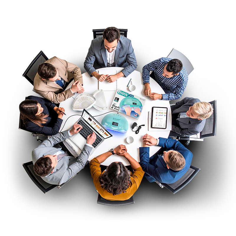 A business meeting with eight people sitting around a round table, discussing healthcare and medical devices, with laptops, tablets, and medical equipment on the table.