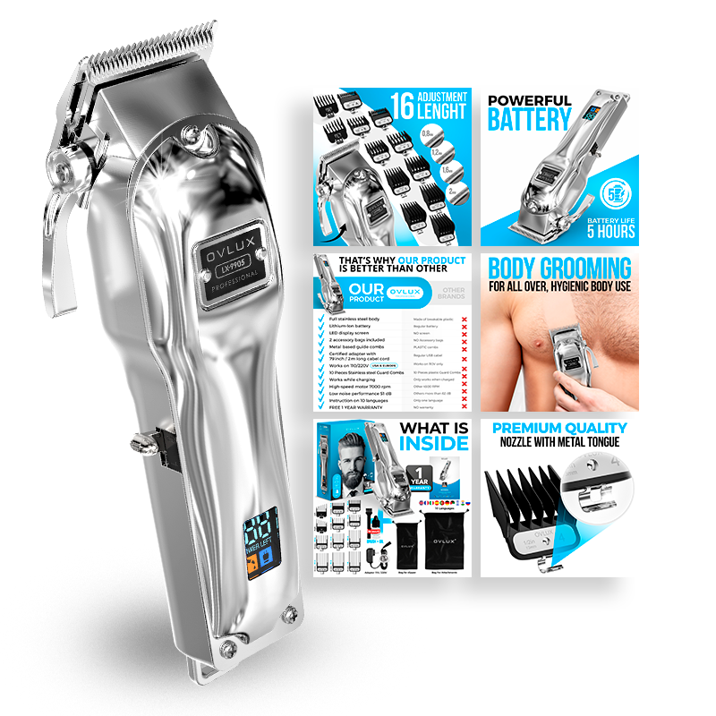 A professional cordless hair trimmer with a digital display, alongside promotional graphics highlighting its features such as a powerful battery, body grooming capability, 16-inch adjustable length, premium metal nozzle, and a 1-year warranty.