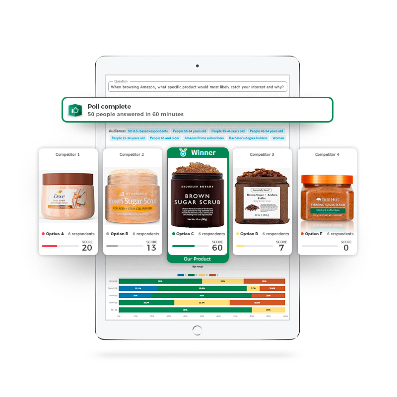 Tablet screen displaying a survey results interface about skincare products, with a highlighted winner for a brown sugar scrub, and four different product options with corresponding respondent scores and bar graphs.