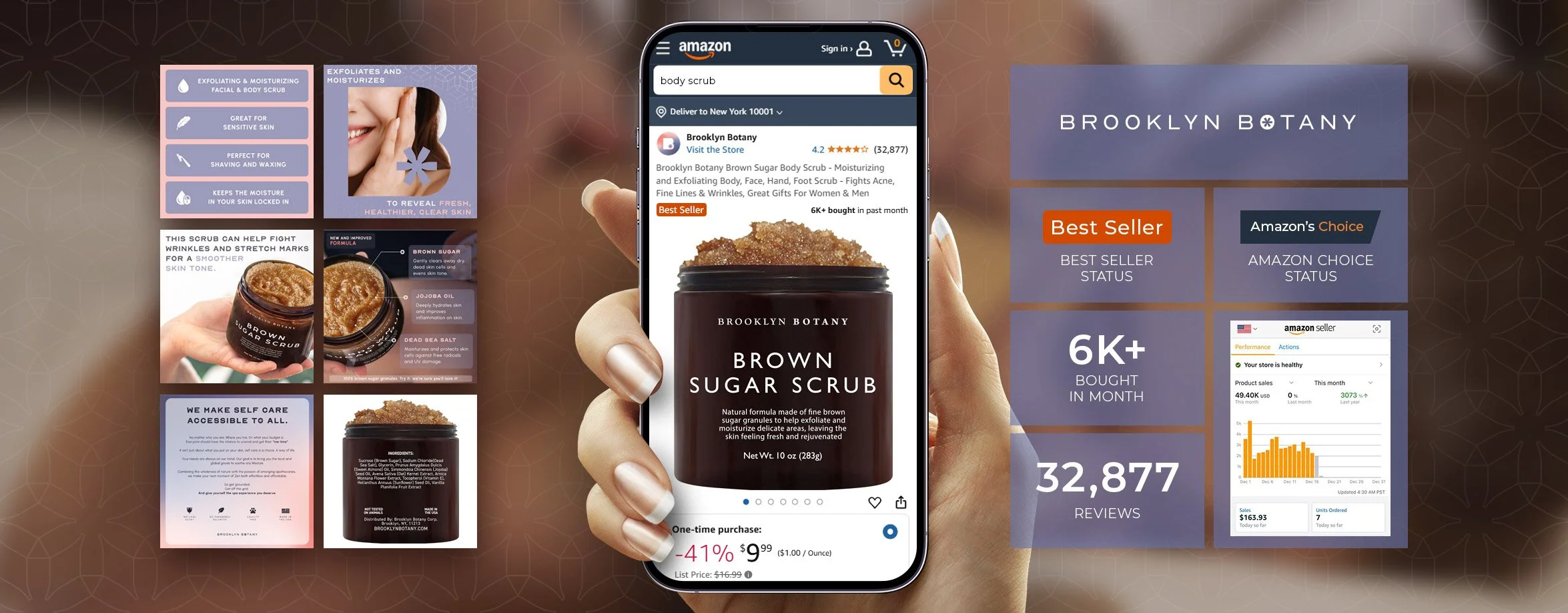 • An infographic showing Brooklyn Botany Brown Sugar Body Scrub, with details about its benefits, ingredients, and customer reviews, alongside a smartphone displaying the product on Amazon with over 32,800 reviews and more than 6,000 units bought in a month.