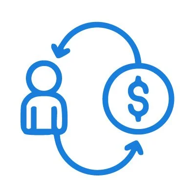 Flowchart with a person icon and dollar sign, linked by arrows indicating money transfer or financial exchange.